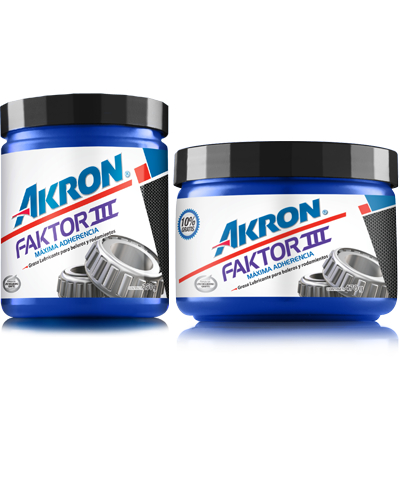 Descripción Akron® Faktor III es una grasa de propósito múltiple, automotriz e industrial, formulada con aceites básicos renados y espesados con jabones de litio producidos con ácidos grasos de máxima calidad, además de un paquete de aditivos de avanzada tecnología a base de molibdeno más grato micronizado, resultando una grasa lubricante que satisface las más diversas condiciones de servicio. Beneficios Excelente comportamiento antidesgaste que permite resistir cargas de choque o de movimientos oscilantes o reciprocantes, debido al contenido de grato micronizado. Alta capacidad de funcionalidad bajo cargas pesadas. Imparte excepcional protección contra la oxidación, corrosión y herrumbre. Excelente resistencia al lavado por agua. Buena estabilidad térmica y mecánica. Posee cualidades de adhesividad y cohesión que evitan las fugas excesivas. Alta temperatura de goteo. Aplicaciones La grasa Akron® Faktor III se recomienda para ser empleada en la lubricación de cojinetes, chasis, ensambles universales, quinta rueda, equipos pesados de construcción, cadenas de rodillos, algunos tipos de engranes, máquinas herramientas, motores eléctricos, bandas transportadoras, montacargas y en todos aquellos equipos que requieren el uso de una grasa múltiple con gran capacidad de extrema presión y antidesgaste, reforzada con grato micronizado y cuyas condiciones de operación sean severas.UsoPara obtener el mejor resultado, no es recomendable mezclar con otros productos. Debe aplicarse en supercies limpias, quitando toda la grasa lubricante existente, aunque ésta tenga la misma apariencia de la grasa nueva. Presentaciones Cartucho 0.400 Kilos, Tarro 0.250 Kilos, Tarro 0.470 Kilos, Cubeta 4 Kilos, Cubeta 16 Kilos, Tambor 180 Kilos, |